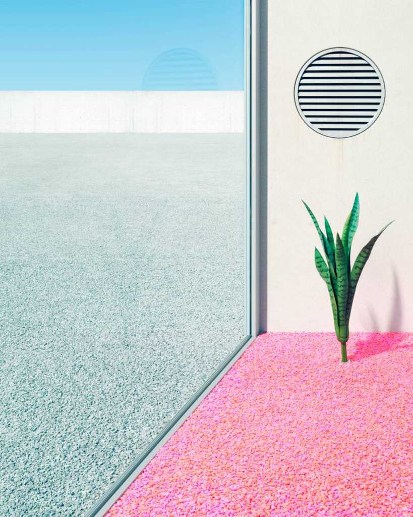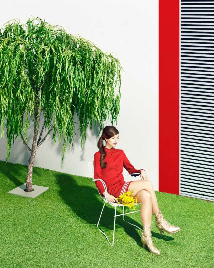 Ascher’in In the Garden dizisi, sakinlerinin çoğunlukla sentetik malzemelerden yapılmış parlak renkli dış mekanlarda keyif aldığı kurgusal bir çevrede geçiyor. Rahatlamak yerine bu tür ürkütücü, minimalist boş lüks idealinde poz vermeyi tercih ediyorlar. Fotoğrafçının teriminden ödünç alırsak, bu bir “plastik ütopya” dır.