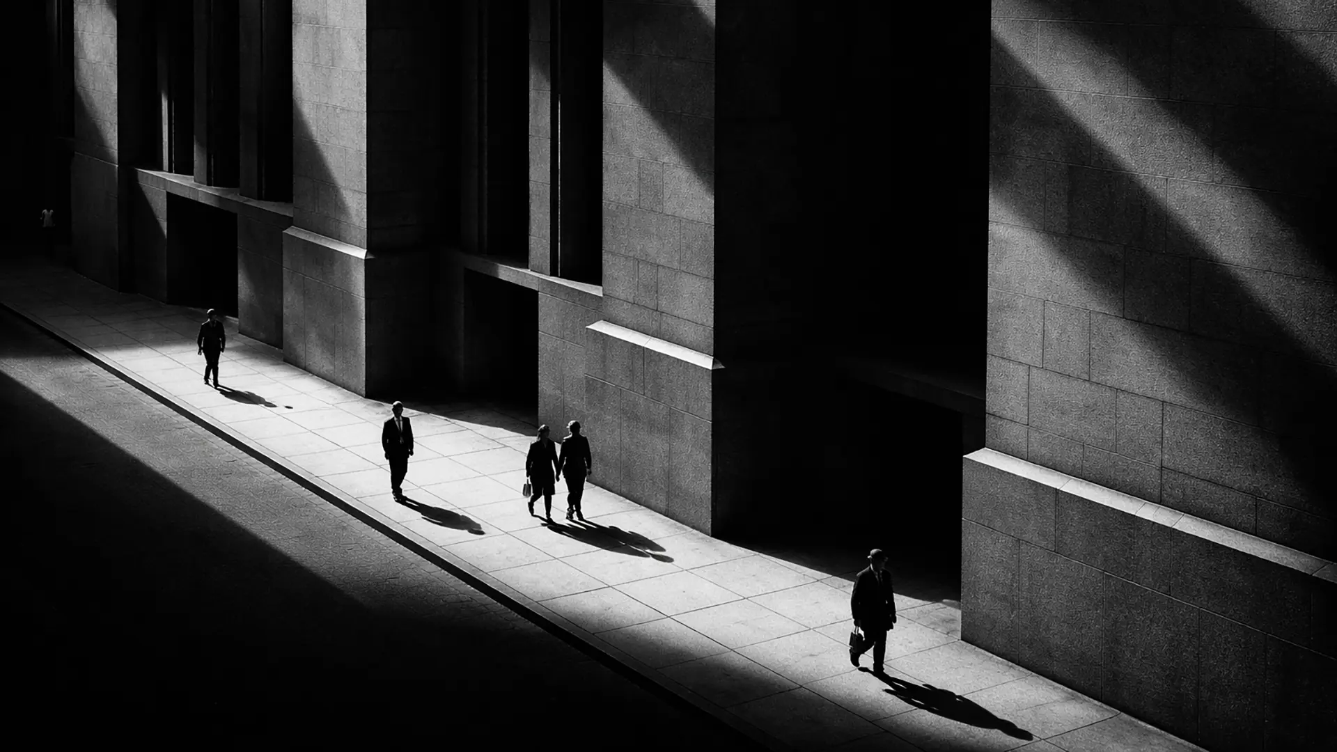 Devasa dikey yüzeyler, sert ışıkla bölünmüş koyu boşluklar ve zemine düşen uzun gölgeler… İnsan figürleri bu kompozisyonun ana unsuru değildir. Aksine, neredeyse hatalı bir detay gibi görünürler. Küçük, yönsüz ve önemsizdirler.