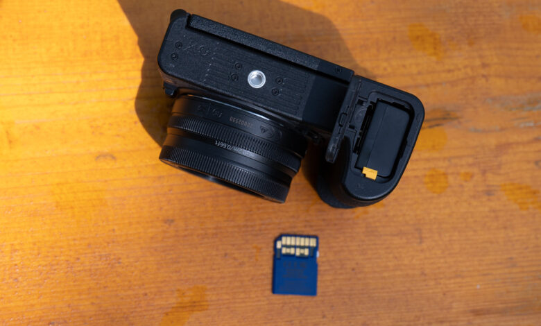 Medya, kameranın altındaki pilin yanında bir UHS-I SD kartında saklanır. Bu, yana monte edilmiş bir kart yuvası kadar kolay erişilemez, ancak tripod yuvasından yeterince uzakta, bir tripod veya plaka takılı olsa bile pili ve hafıza kartını çıkarabilmeniz gerekir.